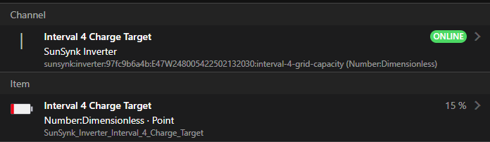 12:29:02.556[INFO] [openhab.event.ItemCommandEvent] - Item 'SunSynk_Inverter_Interval_4_Charge_Target' received command 95 % (source: org.openhab.core.automation.module.script)