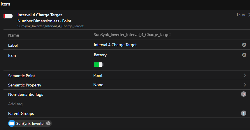 12:29:02.560[INFO] [openhab.event.ItemStateChangedEvent] - Item 'SunSynk_Inverter_Interval_4_Charge_Target' changed from 100 % to 95 % (source: org.openhab.core.autoupdate.optimistic)