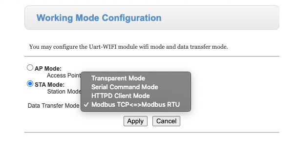 - USR-W610 Gateway in STA Mode and Data Transfer Mode “Modbus TCP <==> Modbus RTU”.