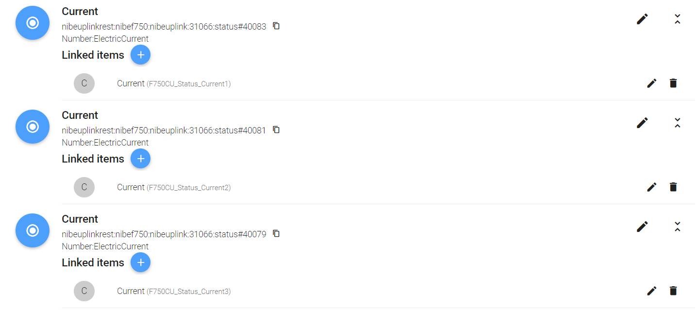 To check what’s up with your current channels enable debug logging by typing log:set DEBUG org.openhab.binding.nibeuplinkrest in the karaf console. Within a minute you should get a few log entries like: Setting channel status#40083 to 0.1 A. If everything works, there should be three entries for channels 40083, 40081 and 40079.