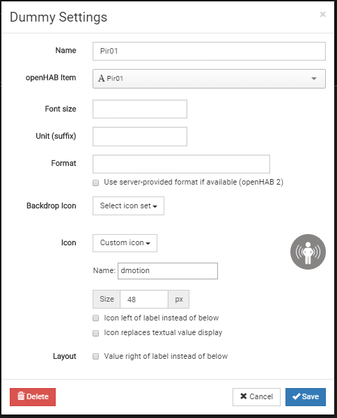 Just a short recap - icon named motion.svg is main and will be used always when there is no sub-icon name used in string item value. Sub icons are named motion-red.svg where the “-” is separator of the sub-icon name and the main icon name (which is also icons group name). The “red” is then the sub-icon identification. So when the item value is “red” the sub-icon motion-red.svg will be used by openhab. I named my main icon dmotion.svg to have different name from the standard openhab motion icon. Don’t forget NOT to use capital letters and special characters (?) when giving icons names. Finally, you should place your icons to openhabian config folder/icons/classic/ (in my case: o:\openhab2-conf\icons\classic\dmotion.svg). Of course, these dynamic icons work in the sitemap too.