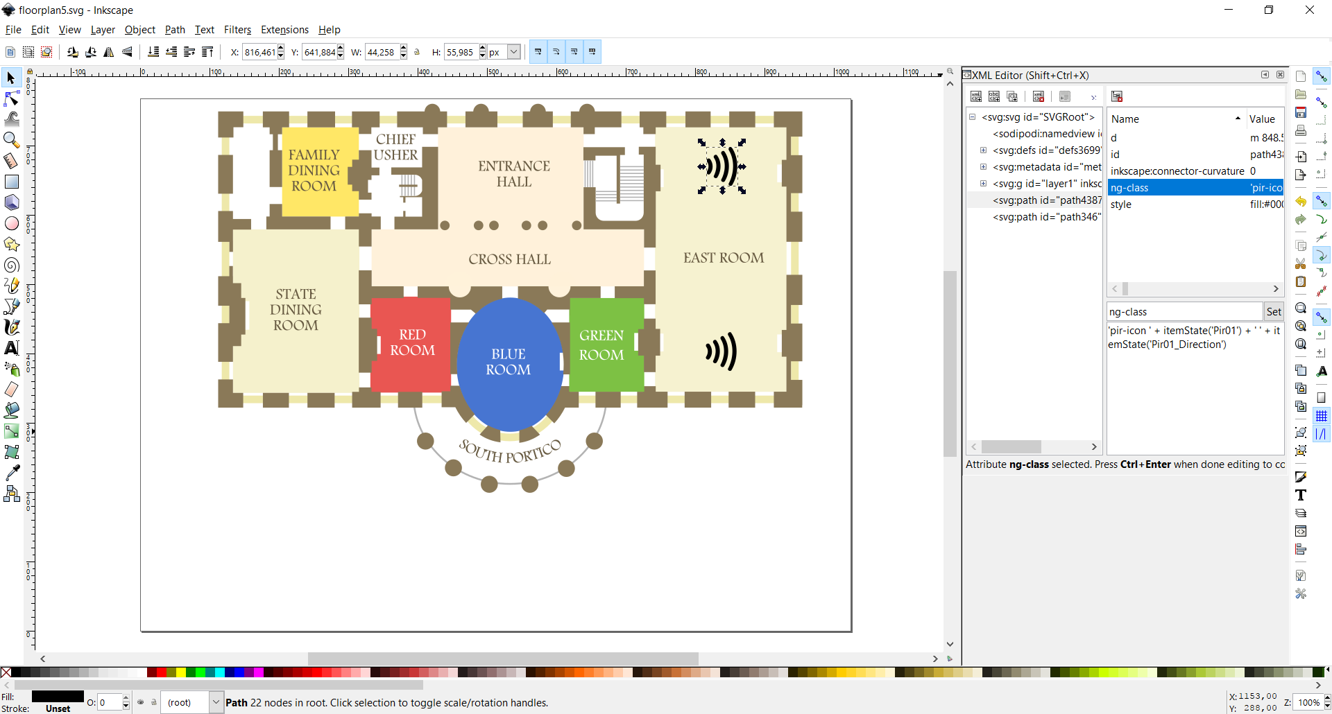 I also wanted to be able to easily track the path of the person moving (for many reasons). So I decided to change the icon color (almost like a traffic lights) depending on a time elapsed from the motion detected. So when motion detected (+5 more seconds) the icon is red, then for next 5 secs orange, then orange light and finally yellow. Afterwards is set back to original grey. See also below…