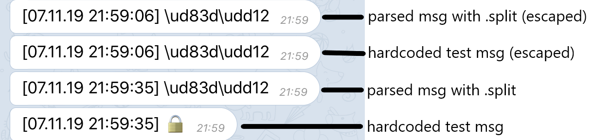 When I am sending the follwing message via command-cli, the Gateway-message is pure text whereas the testing message contains the lock-emoji (https://charbase.com/1f512-unicode-lock): openhab> smarthome:send Telegram_Gateway "userxxx;\ud83d\udd12"