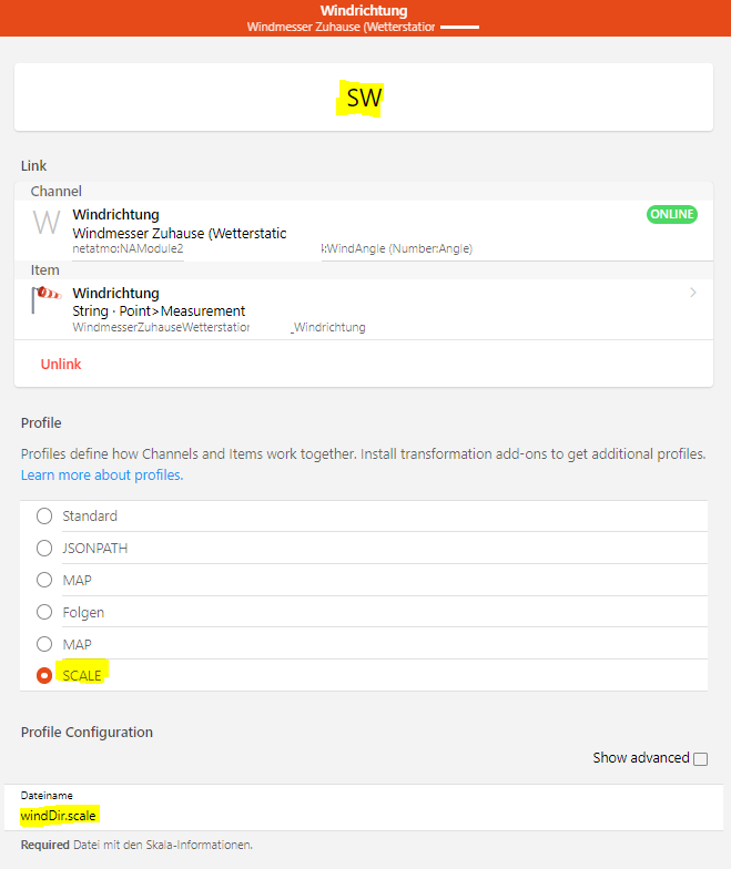 Everything worked fine. The item showd a number value in degrees and did so on my sitemap. But because this is difficult to read I wanted to scale the vaule to the typical terms (N, S, W, etc.). So I installed the Scale Transformation Service an followed this german guide OpenHAB Windrichtung von Grad in Himmelsrichtungen konvertieren.