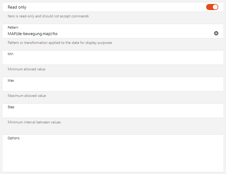 I am mostly using the UI, where I can’t see this pre set Metadata so I looked via REST API to confirm the wrong Metadata. I was then able to change the stateDescription:pattern via UI by “Add Metadata” → State Description → Pattern → “%s”. That did not delete the other unnecessary stateDescriptionminimum, maximum and step but was enough to get my sitemap working.