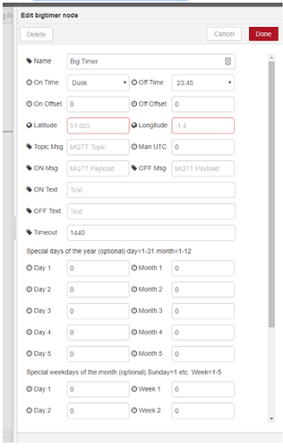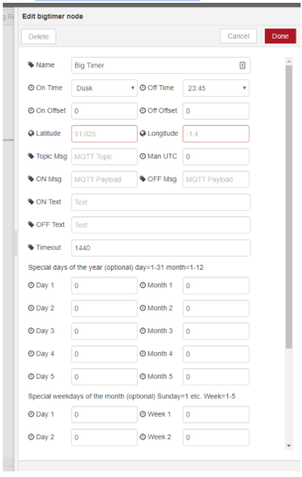 To create rules to trigger at a specific time like the Openhab “Time cron <cron expression>" trigger, is where the addon node BigTimer comes in. This node not only replaces the Time based triggers but also sunrise / sunset based triggers that you would normally use the Astro Binding for.
