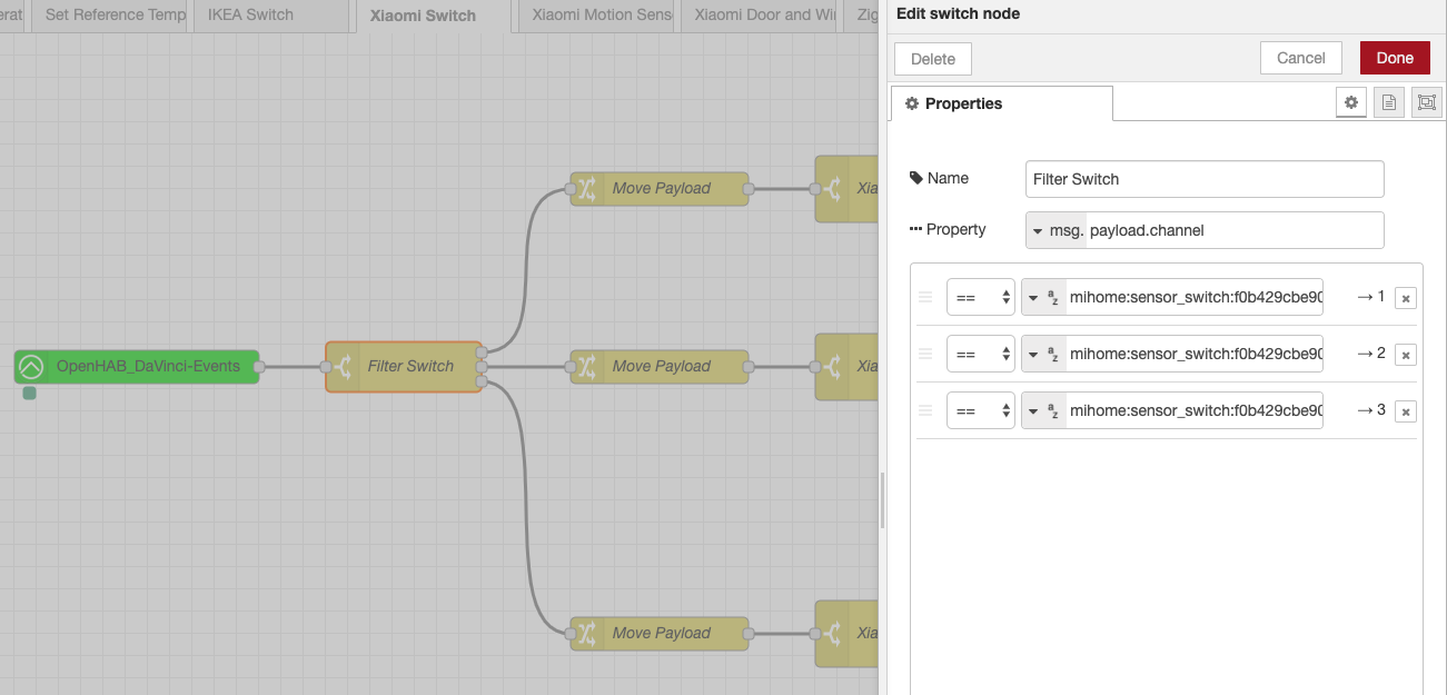 In the image I’m using the same switch node to extract data from 3 different Xiaomi wall switches.