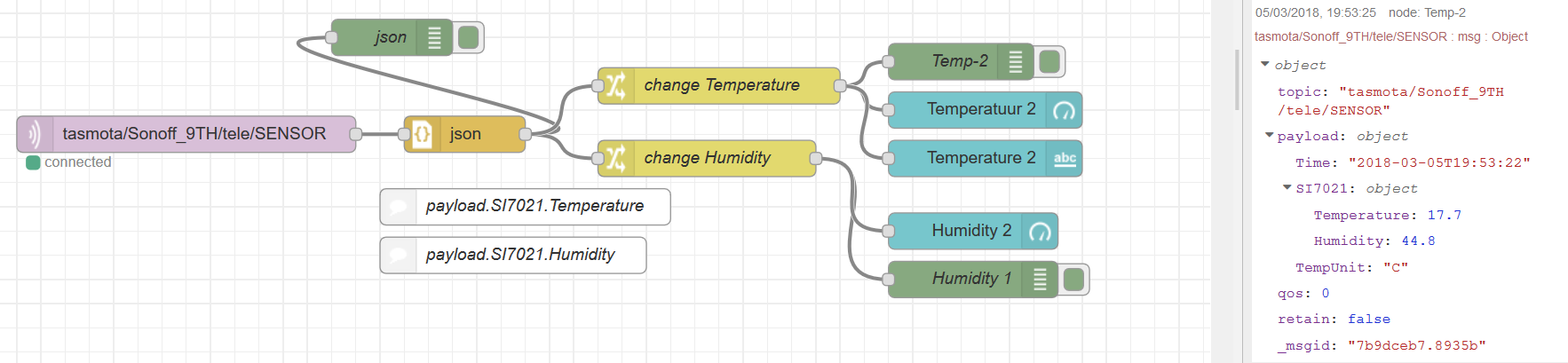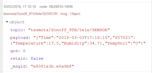 I am trying to start with node-RED as an alternative rule engine. My first attempt is getting my Sonoff TH16 switches working. I have two of those, which have a S17021 temperature sensor and the other an DS18B20 Temp and Humidity sensor. The switch part of these Sonoff’s is working perfectly. That was the easy part ![]()