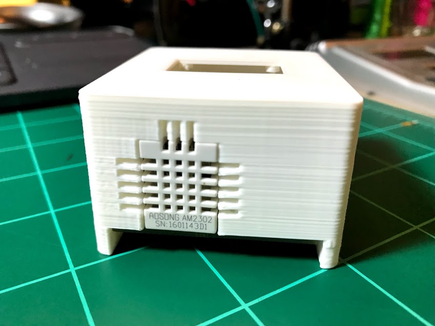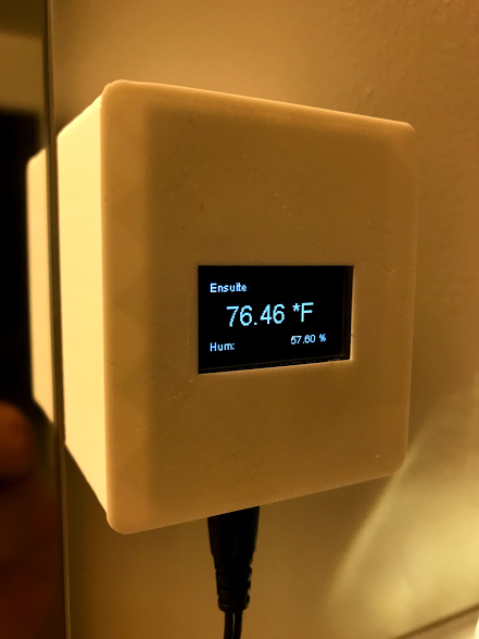 The enclosure is designed in Fusion360, printed on my Prusa i3. I added an OLED screen to locally show temperature and humidity, while the NodeMCU carrier board/temp sensor is fully enclosed behind it. Sensor is read once a minute, and sent to the local screen and my MQTT topic in openHAB.