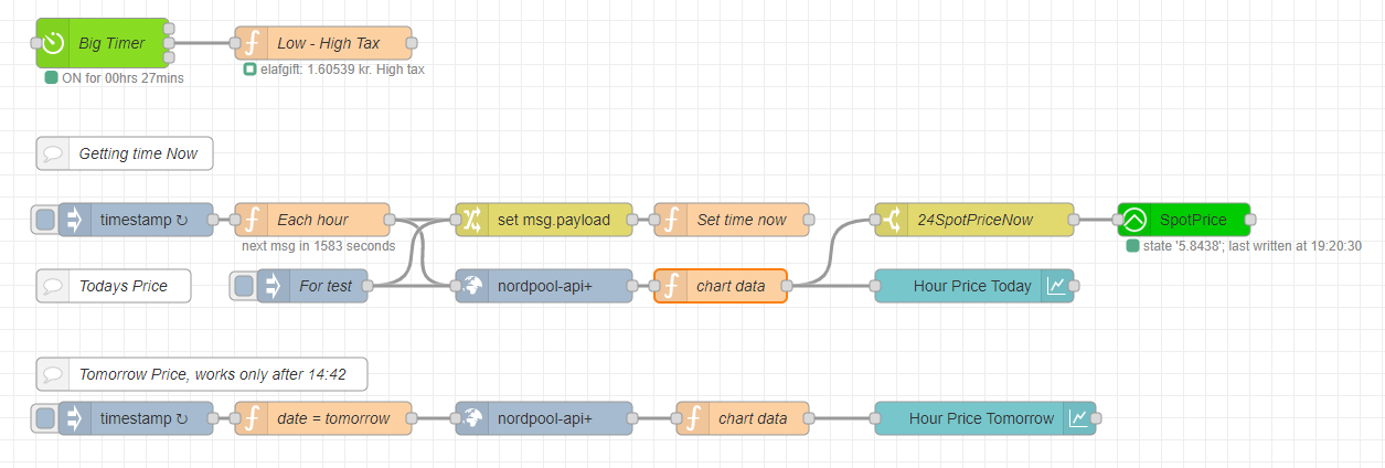 Only number I needed in openHAB is the Spot price including tax and vat. Big Timer change between low and high tax depending on the hour, each hour request to Nordpool, this also set time now to global.set, chart data add the tax and vat, a change switch filter out the spot price now and update the item from openHAB