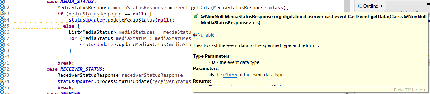 I’ve tried all kind of creative ways to apply @NonNullByDefault({}) to no avail. It is simply adamant that the method is @NonNull when it in fact is @Nullable. I’ve even tried removing @NonNullByDefault from the class, which usually resolves all “null weirdness”, but in this case, it makes no difference.