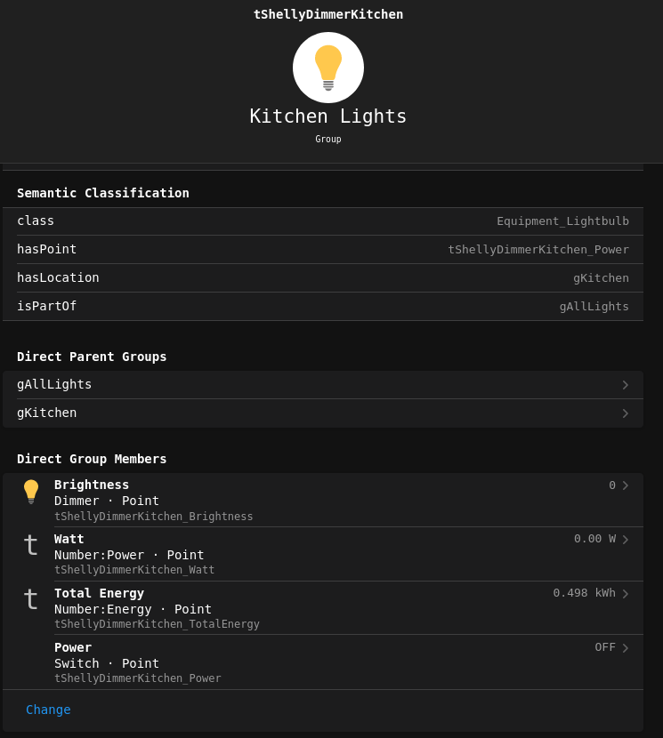 Either way, to me this setup seems strange - I’m not sure that a Group with aggregation functions applied should hold a number of different types of members. You’ve got numbers, switches and dimmers in the same Group. Usually, a Group with aggregation functions applied has members of a single type (only switches, or only numbers holding energy values etc).