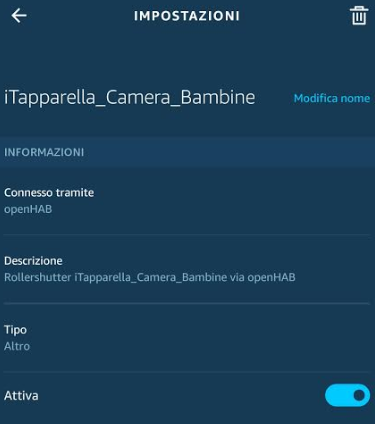 I’ve just tried to say “alexa chiudi la tapparella del soggiorno” or “alexa close the living room blind” but alexa said the this function is not available