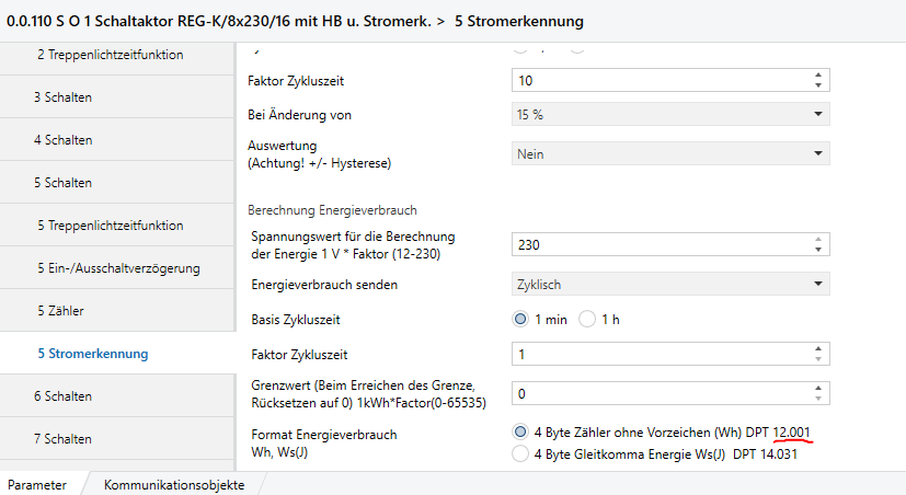 Now, the DPT is set to 12.001, which is dimensionless. I’m pretty sure this is the wrong DPT, please tell us about the device. Wh is 13.010 (both 12 and 13 are 4 Btyte values, but 12 is unsigned and 13 is signed, so please take a deeper look at it).