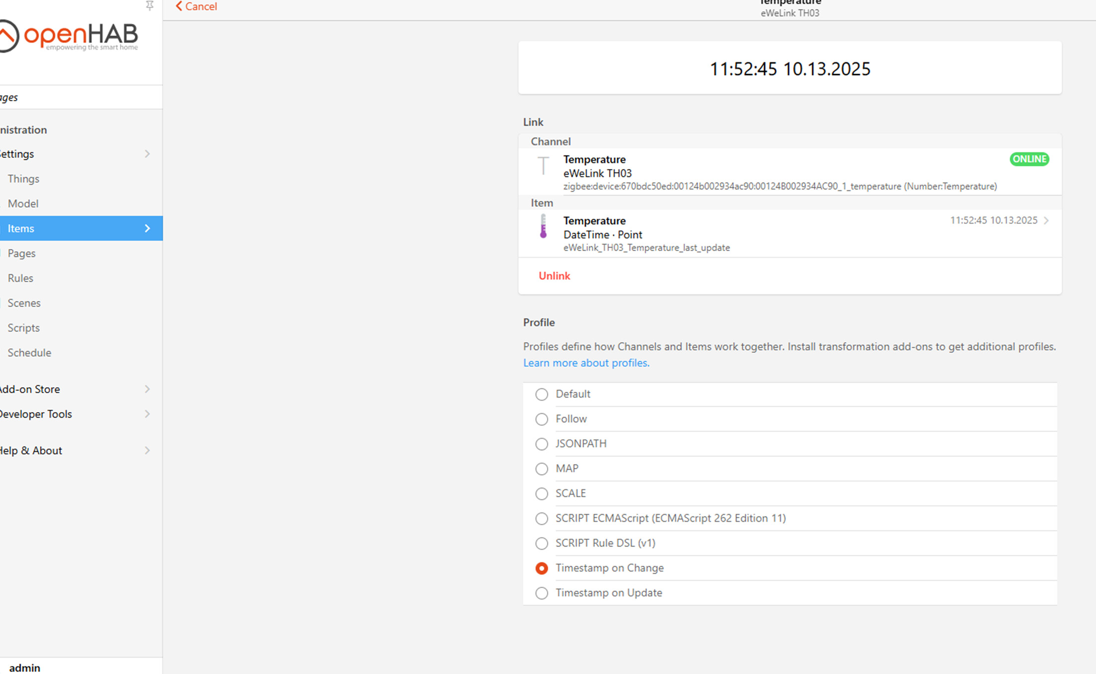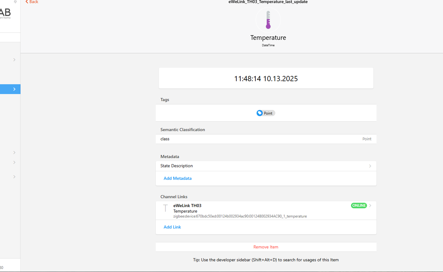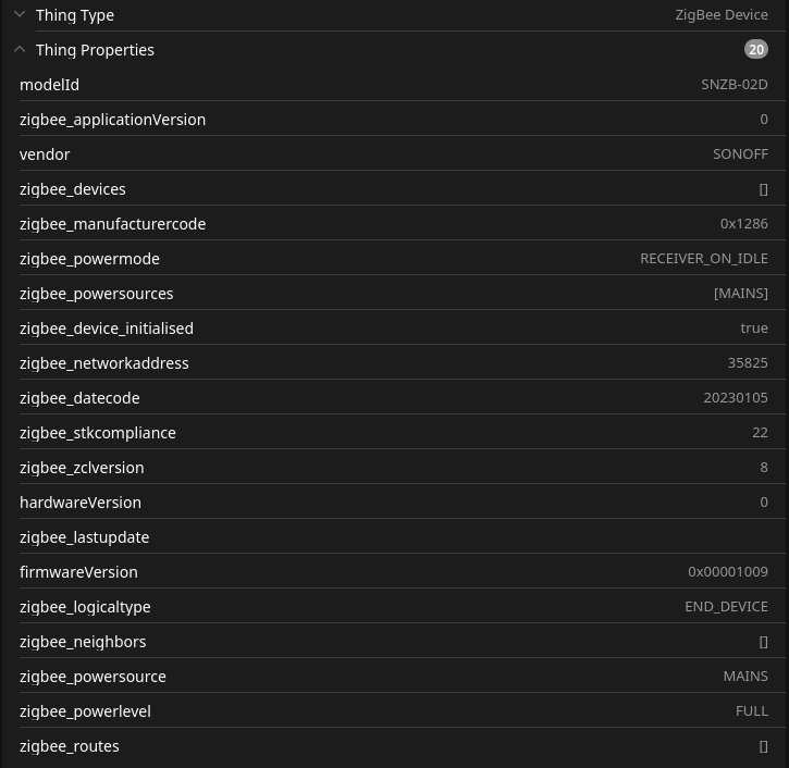 I’m running a Raspi 4B, with 8GB and OH 5.0.1 directly on the Pi. Since I have WLAN connection issues I’ve connected as well a WLAN-USB extension and that problem vanished. For Zigbee I’ve connected directly a SLZB-07 and bound it with Ember Coordinator. I’ve connected 6 temperature sensors from Sonoff (SNZB-02P/D) and one power plug from INNR (SP 240-2).