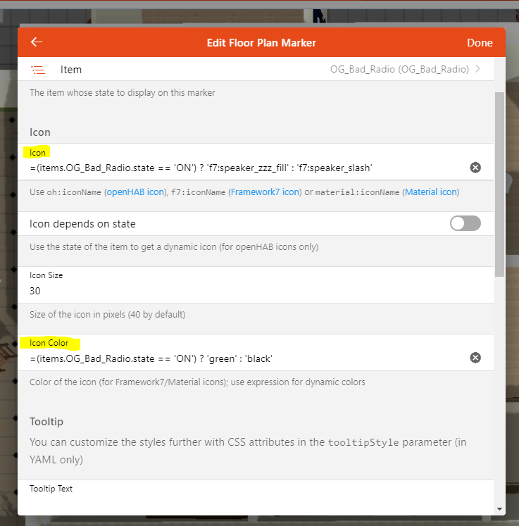 : - if you were typing this directly into the code page or widget developer the colon in this expression would confuse the YAML parser because colons have the important meaning of dividing a property name and it’s value. To fix this oyu would have to enclose the entire expression (= and all) in another set of quite different than what you used to the pieces inside the expression. I used single quotes ' for the expression strings, so I’d have to put double quotes " around the expression. YOu don’t have to do this when you are using the widget settings dialog, it will do that for you automatically.