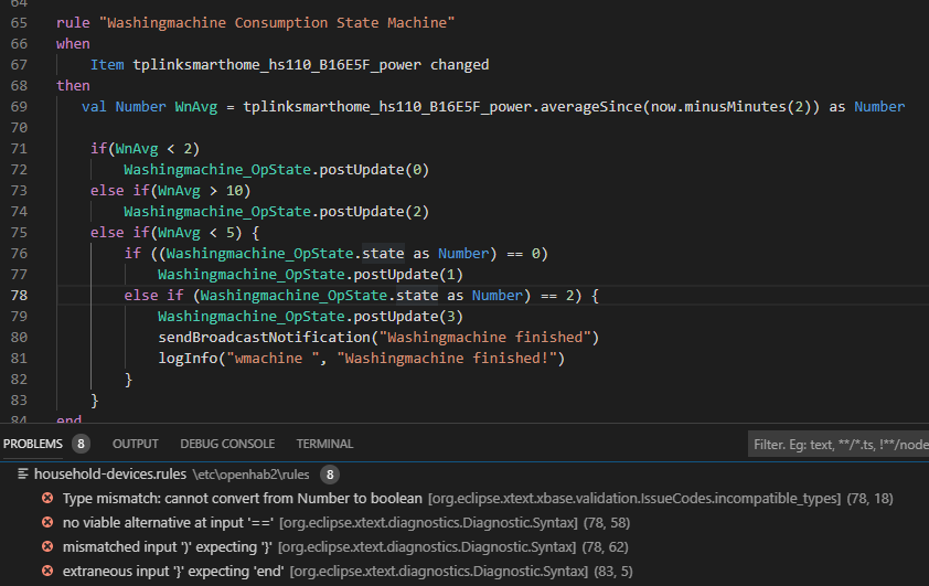 To be honest, I’m a bit confused by the MODE_OFF (and the others) status, as this is no status. Either use a Number (0 Off, 1 Standby, 2 active, 3 finished)or use a String Item. I don’t know if this error will have impact to the trailing line. I would do it like this: