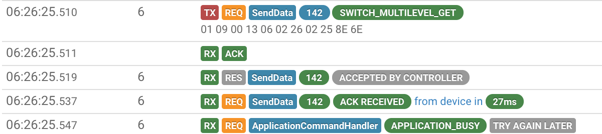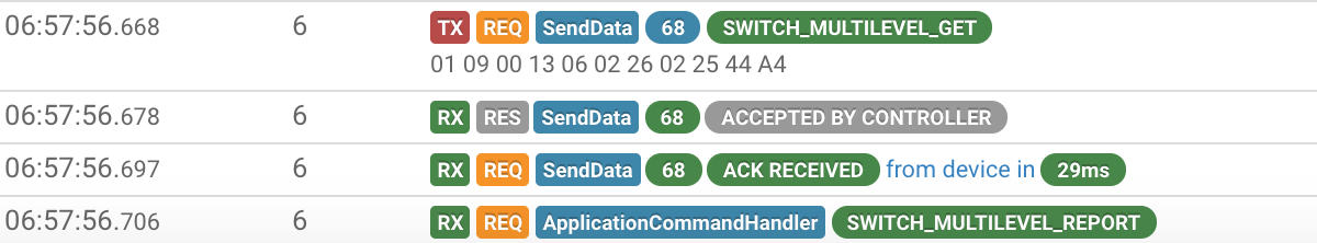 2018-07-21 06:57:56.700 [DEBUG] [l.serialmessage.SendDataMessageClass] - NODE 6: SendData Request. CallBack ID = 68, Status = Transmission complete and ACK received(0)