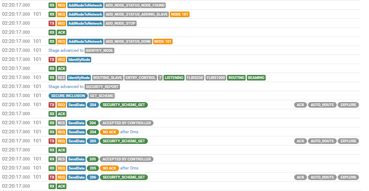 I am not either. The majority of my network is mains-powered. My OH2 server is on a UPS, so I shut off the mains power for the whole house to try to limit the amount of Z-Wave communication going on during the inclusion process. Same issue. Hereās a snippet from the log viewer. I am not sure I am reading it right, but it looks to me like the controller assigns an ID (101 in this case), advances to the security stage, sends SECURITY_SCHEME_GET, receives an ACK from the node, accepts it, then times out at 0ms saying there is no ACK? This then just repeats until it apparently times out and moves on.
