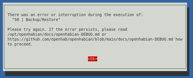 + whiptail --msgbox 'There was an error or interruption during the execution of:\n "50 | Backup/Restore"\n\nPlease try again. If the error persists, please read /opt/openhabian/docs/openhabian-DEBUG.md or https://github.com/openhab/openhabian/blob/main/docs/openhabian-DEBUG.md how to proceed.' 14 80