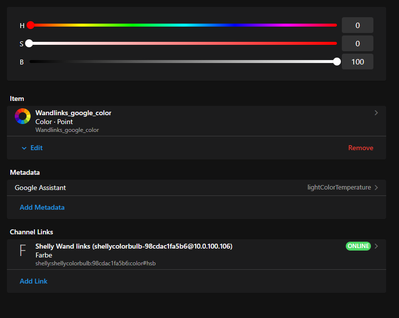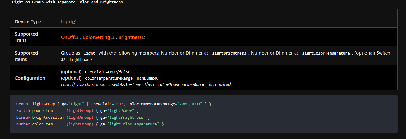 The temperature item wants to recieve a number between 0 (cold) and 100 (warm). Thus I thought to use colorUnit=percent as seen below however than google doesn’t accept the item (it doesn’t show up in the home app)
