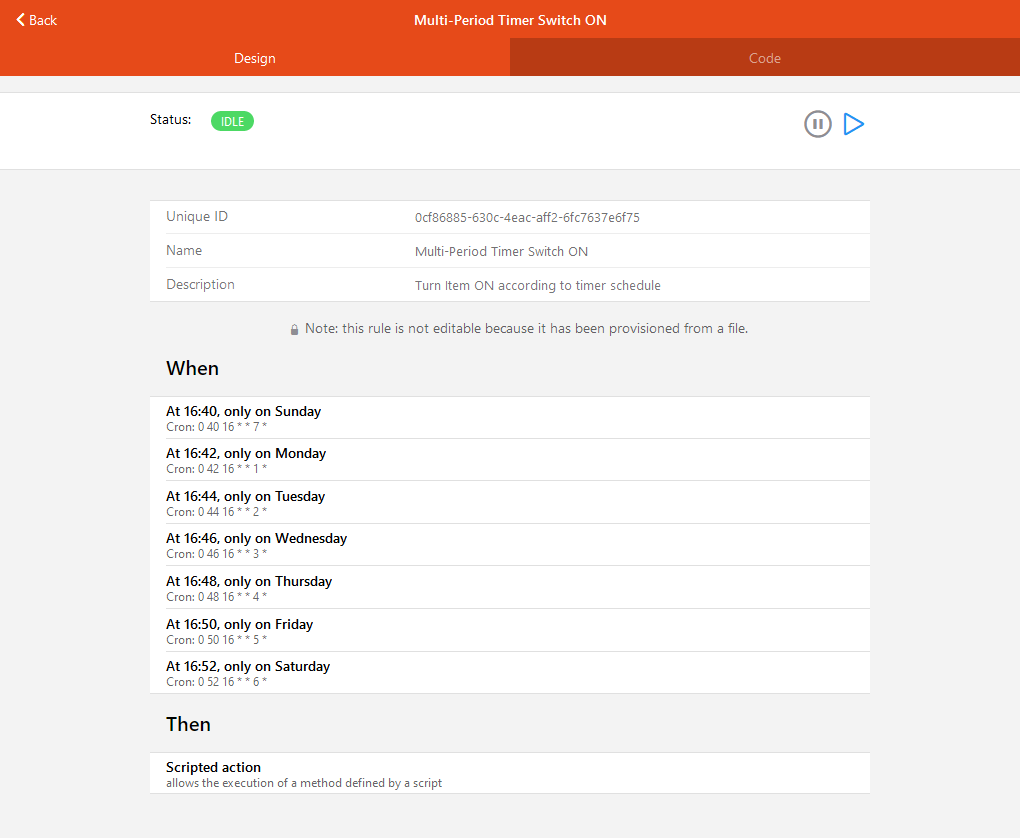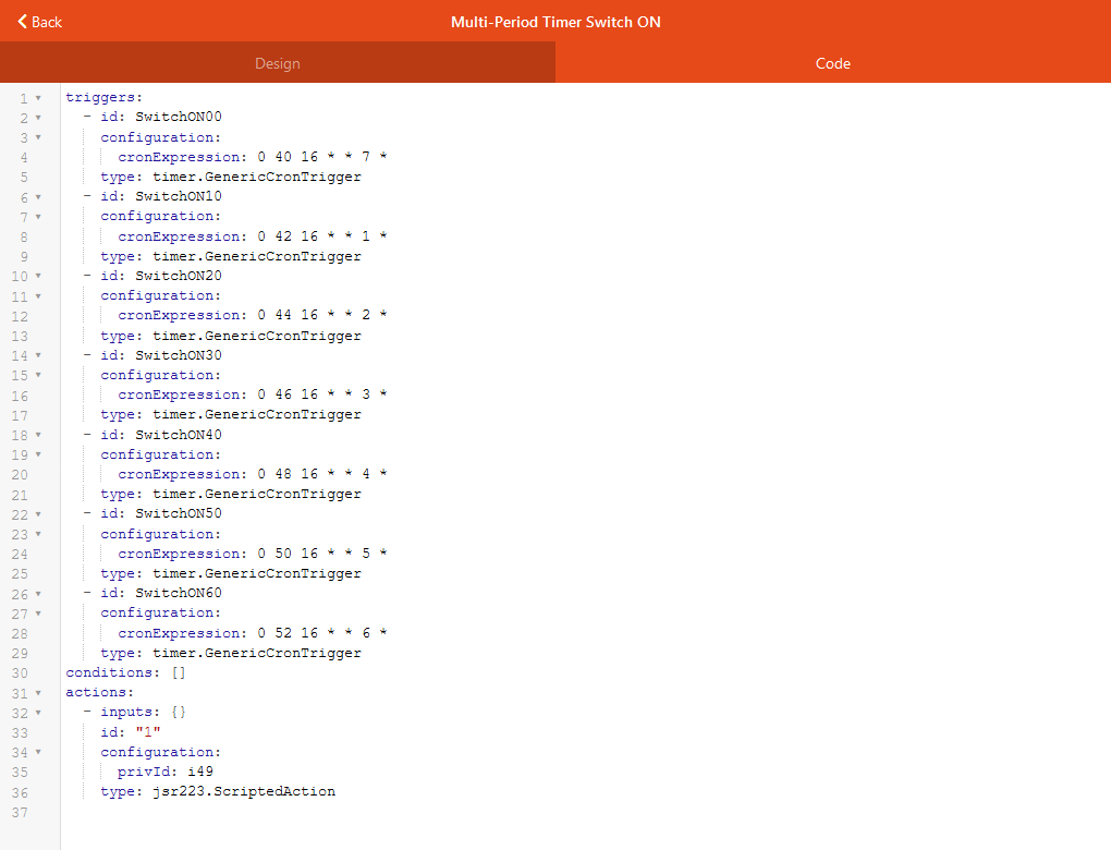 I created a rule that triggers on a specific day of the week but when testing found that the trigger did not work. So I created a pair of rules (one to switch a device ON and another to switch it back OFF a minute later) which which have triggers for each day of the week, with each trigger having a different time. In the UI the ON rule shows as:
