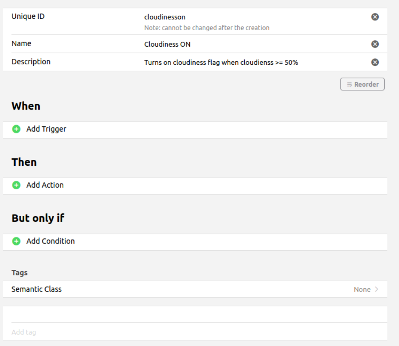 Here’s an example of a simple rule I have to set a Switch to ON when cloudiness gets above a certain percentage.