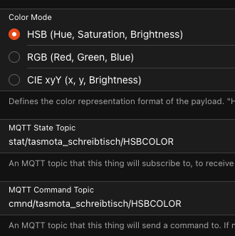Strange. I see the stat/tasmota_name/HSBCOLOR mqtt topic coming from Tasmota. Can you send the HSBOLCOR command manually over MQTT Explorer (cmnd/tasmota_schreibtisch/HSBCOLOR) with contents e.g. 135,0,100 and check if you see the corresponding stat message in MQTT Explorer and in openHAB?