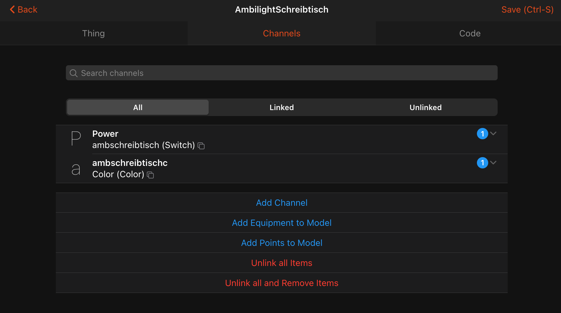 Each channel is linked to a corresponding item (like your Ambilight Schreibtisch Color, which looks perfectly fine). If all items have “Property_Light” set you can now operate all items in MainUI, in tab “Equipment” on the card “Lights”. In my case it looks like this: