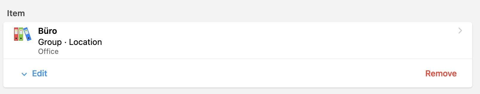 You should be on the item page of the equipment group item. Now click “Edit” in the top right and you can select the location(s) under “Group membership” → “Parent Groups”.