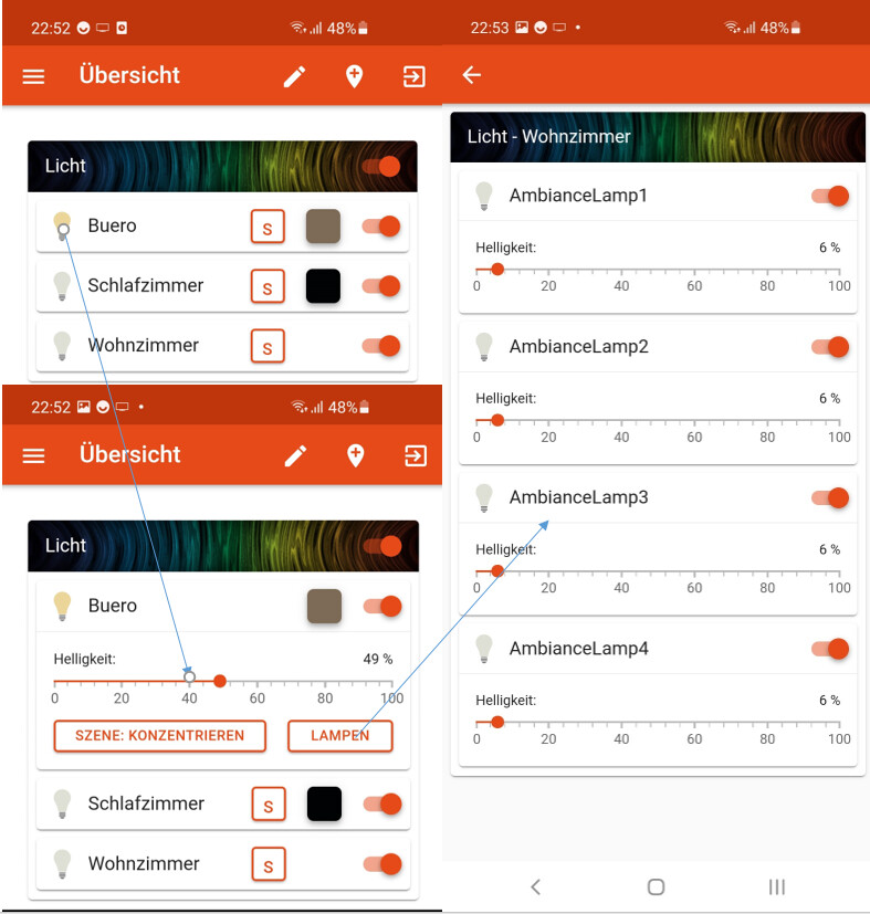 - Switch and dimmer items have to be setup manually with “_Betrieb” and _“Helligkeit” for each single rgb lightbulb (not for rooms).