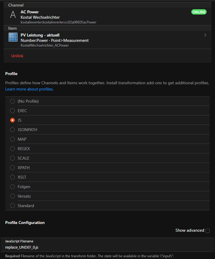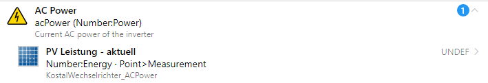 2021-03-06 17:55:51.926 [INFO ] [openhab.event.ItemStateChangedEvent ] - Item ‘KostalWechselrichter_ACPower’ changed from 0 W to UNDEF
