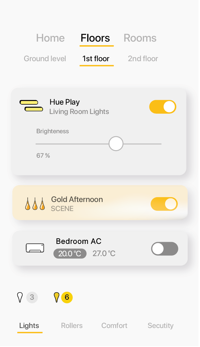 For each “Floors” menu there will be “Rooms” sub-menu to manage and control each single device.