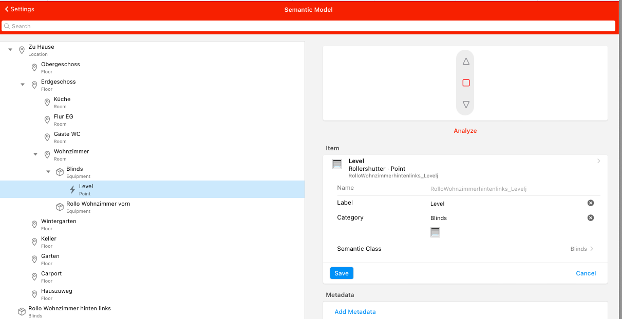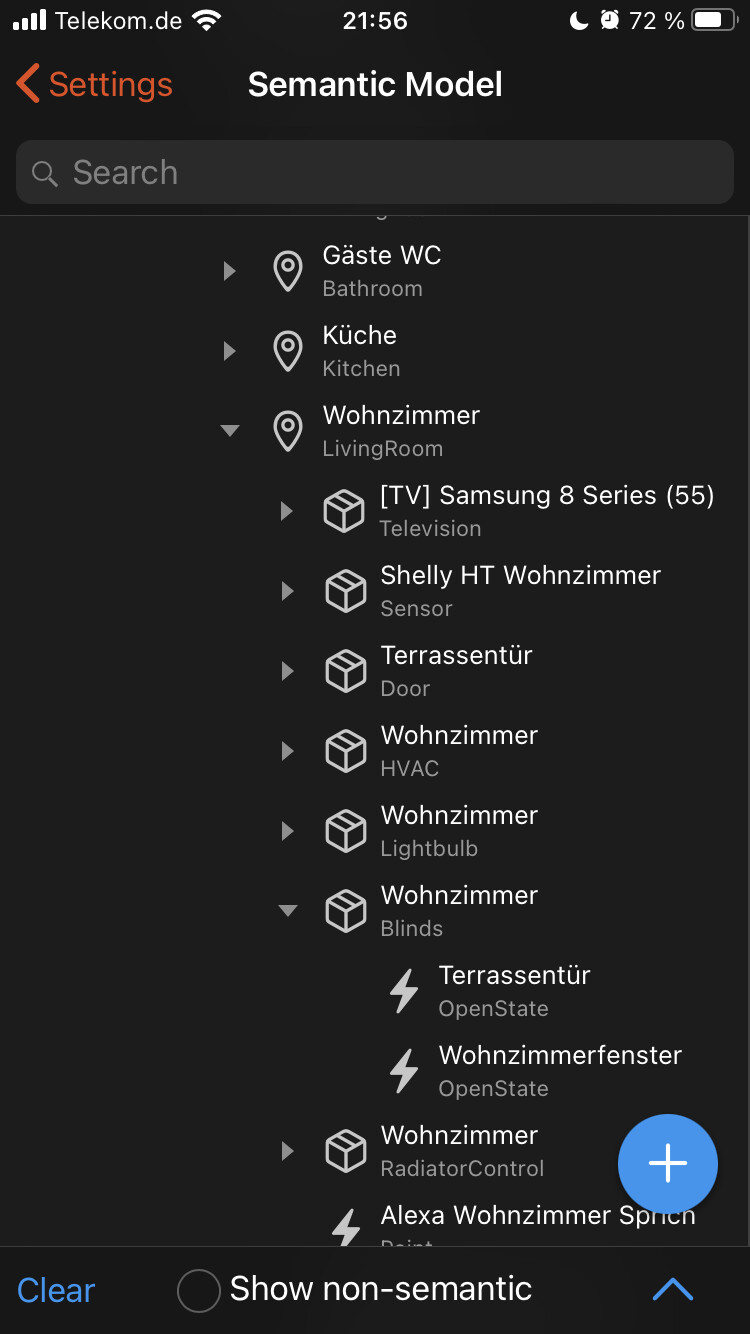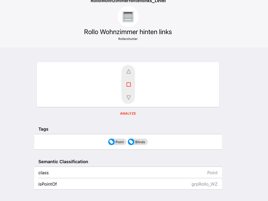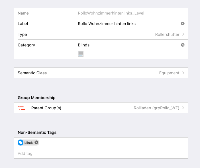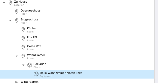 I have a floor “Erdgeschoss” in this floor there is a room “livingroom”. In this room there is a blinds equipment and in there my blind is assigned. The blind is tagged as “Blinds”.