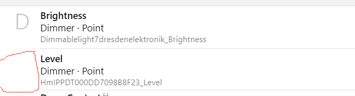 The item list contains two dimmer items. One of the dimmers (Deconz binding) shows a “D” as icon. The other dimmer of the Homematic binding does not show any icon: