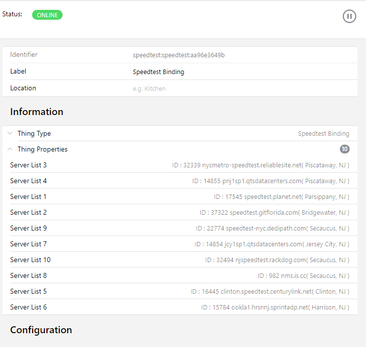 Just setup a fresh openHabian and installed both Ookla and the binding and that’s the only issue I see. I did not set anything but the refresh rate on the binding config.