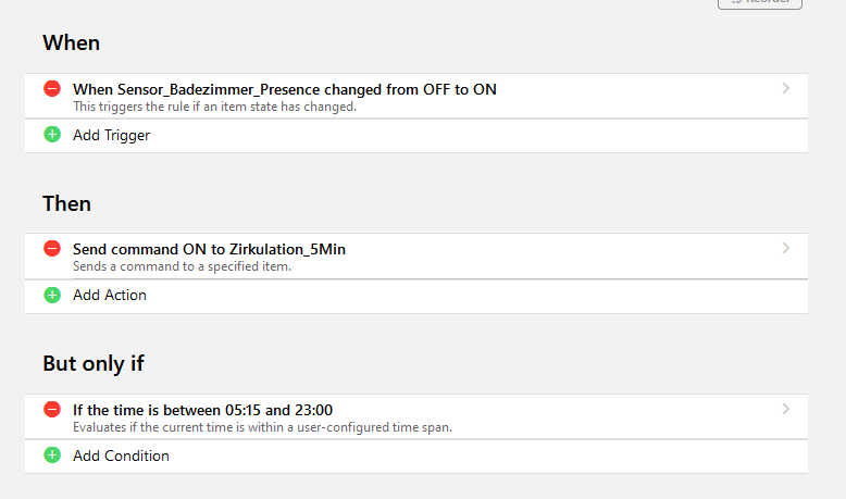 Turning on that switch will result in the corresponding rule to be triggered, which is supposed to check if the pump (the actual switch for it is called Zirkulationspumpe) is OFF, and if that’s the case, it should check if the pump has already been turned ON in the past 25 minutes. If that is the case, it should not do anything. If it wasn’t turned on, it should turn it on for 5 minutes and turn it off after those 5 minutes.