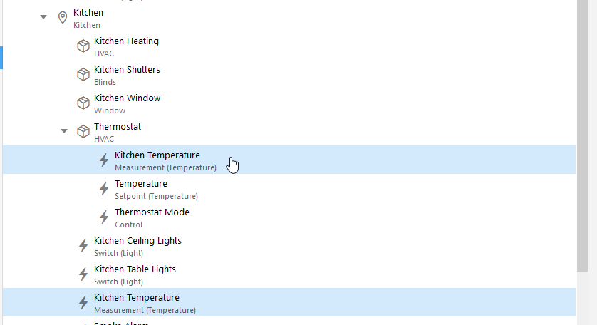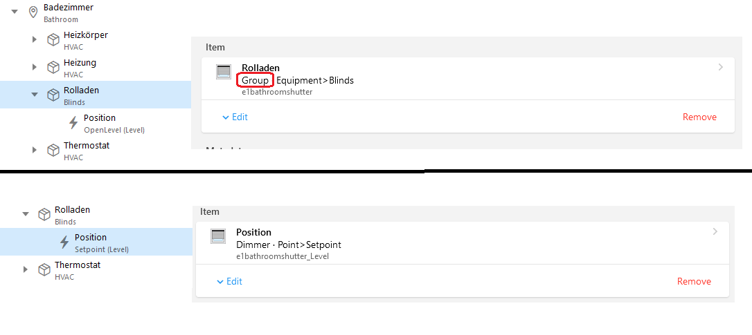 It shows at least an equipment with items that represent attributes of it. What I really don’t understand is why should I also add them to the parent Kitchen group. At least in my mind it makes sense that the equipment is able to show/control it’s main purpose by using an appropriate type and link it to the “main” channel. But then you would have to change them back to group before you’re able to create and link new items.