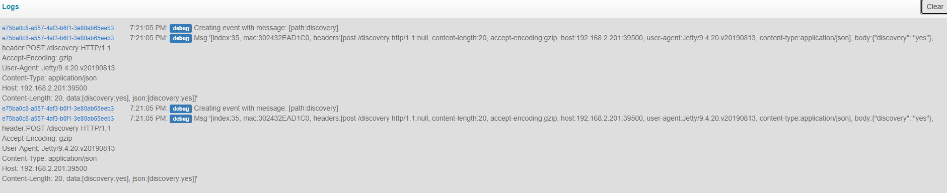2020-12-22 14:58:40.583 [DEBUG] [s.internal.SmartthingsHandlerFactory] - Sent message “{“discovery”: “yes”}” with path “/discovery” to the Smartthings hub, received HTTP status 202 (This is the normal code from Smartthings)