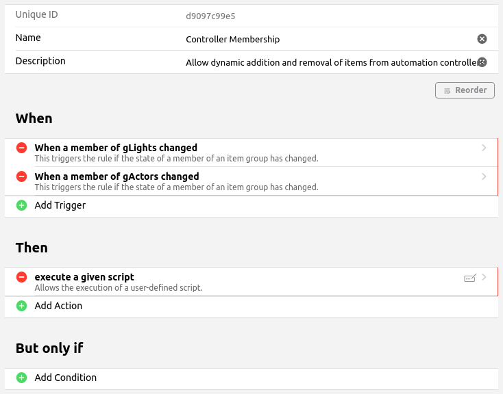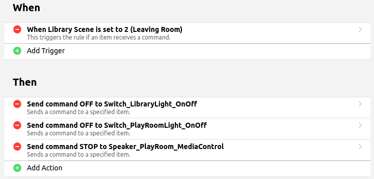 The scene membership is also handled by a single rule. The information about each scene is stored in a custom metadata namespace (in this case ActiveItems). This rule runs any time one of the items in any of the basic groups changes. When an Item changes, it checks through each of the scene controlling items to see if any are in the ADD or REMOVE state. If a controller is in the add state then the ActiveItems metadata gets a new key that is the name of the item which just changed and a value that is the new state it just changed to. If the controller is currently set to REMOVE than the metadata key matching that item name is deleted from the ActiveItems namespace. So to populate your scenes you just set the scene controlling item to ADD (using the widget) and then change all of the items you want controlled to the states you want them to be in for the scene. To remove an item from a scene, you just set the controller to REMOVE and do anything that changes the state of the item you want removed. When you’re done you just reset the controller item to ON and your scene is ready to go whenever you have a rule that sends that controller item to the library function.