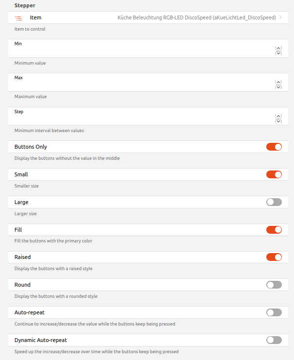Sure. Sorry for not posting it already with the 1st post. I just defined a “Default List Item Widget” via the UI. But unfortunately there is no setting to configure the command being sent by the stepper. Maybe there is an option as YAML parameter.