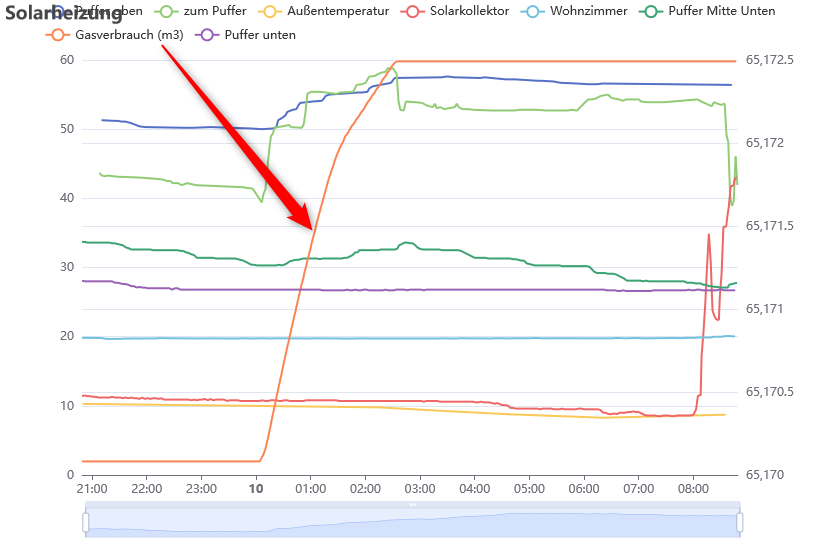 as the gas counter is installed some 20 years, the value is right now >65.000 m3 of gas. In the chart page i could activate “Do Not Force Scale to Include Zero” so the graph show a difference of 2m3 on this high values.