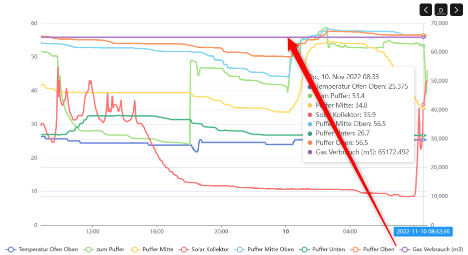 I created a custom widget to represent my heating. As you can see from a “chart page” I created in parallel, the gas consumption tonight heated my layered storage for warm water and heating (the orange line):