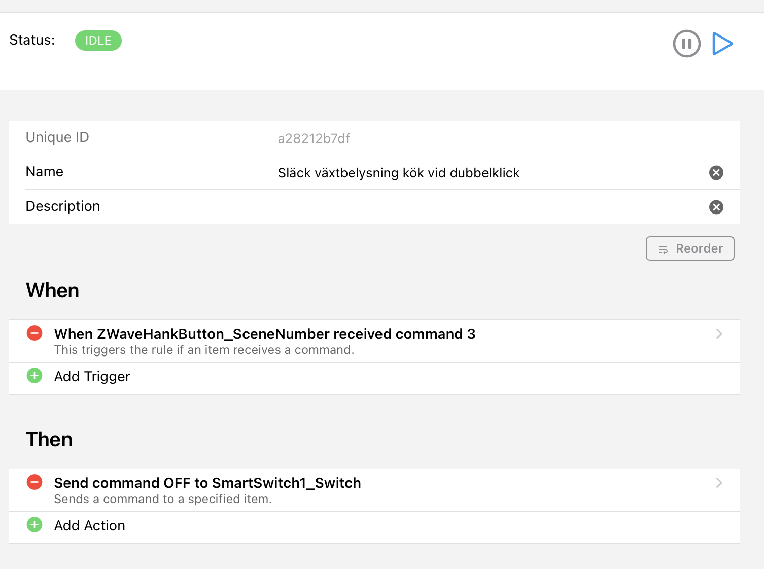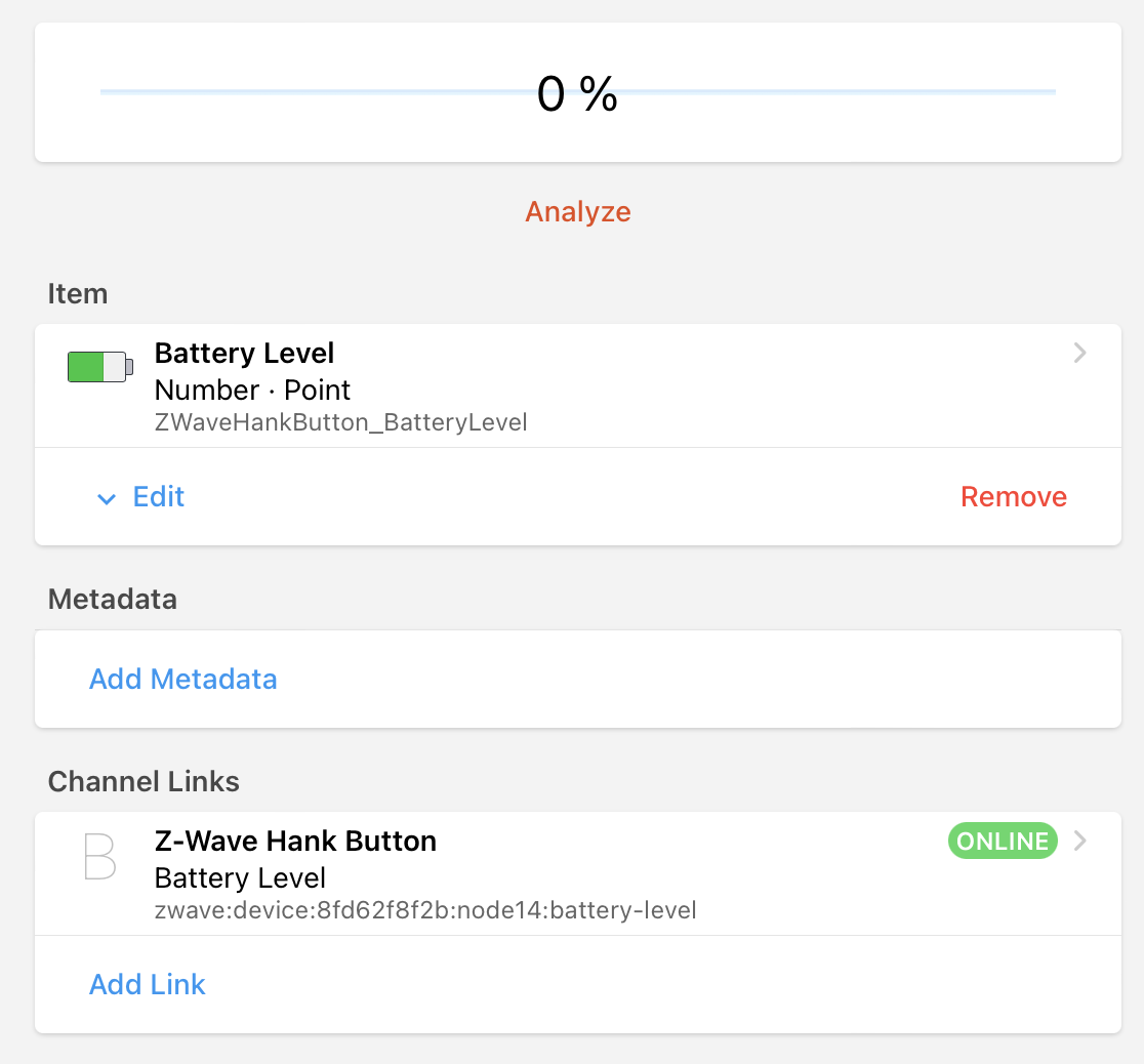 Now I’m trying to create rules that react to the Hank SCN01 when pressing the button. I have no success. The rule works if I play it, but nothing happens if I press the button. I can see that the device is online, but the only “sensor” is battery level and it is reported as 0%. I have set zwave to Debug level for logging, but I see nothing in the logs when the button is pressed. The top side led is only blinking blue a lot. Something I don’t understand when investigating the manual.
