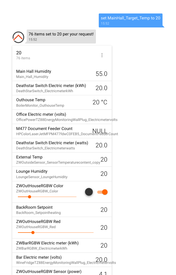 I installed Habot… And accessed the interface. And asked it to set a single item (MainHall_Target_Temp) to 20… And it cheerfully told me it was setting 76 items to 20…