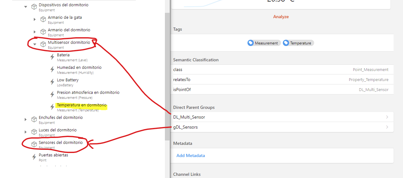 Why do you need “Sensors del dormitorio” and, if you do need it, why does it need to be part of the model? But putting the sensor Equipment or Points into that room it’ll already be a sensor in that room. There is no need to create yet another Group to represent the sensors of the room, at least not for the model’s sake.
