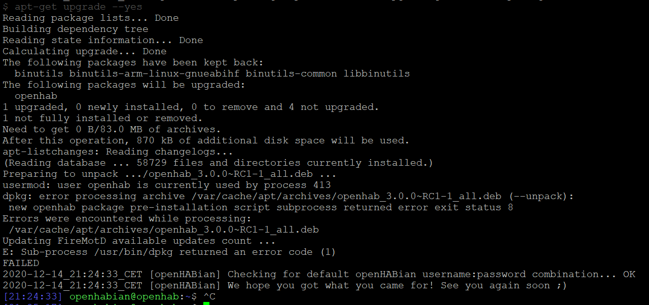 I have tried to upgrade from M5 to RC1 using âsudo openhabian-configâ, master and option 2 : Upgrade System - but I get the following error: