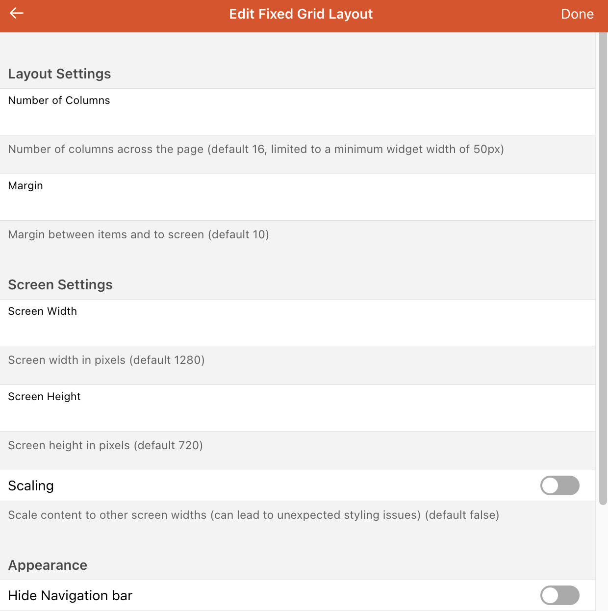 For canvas layout, placement is completely free and user defined so there is no notion of lines or columns. You do have a grid pitch setting but it is just for temporary edition with a snap to grid feature. It will not affect anything that has already been placed.
