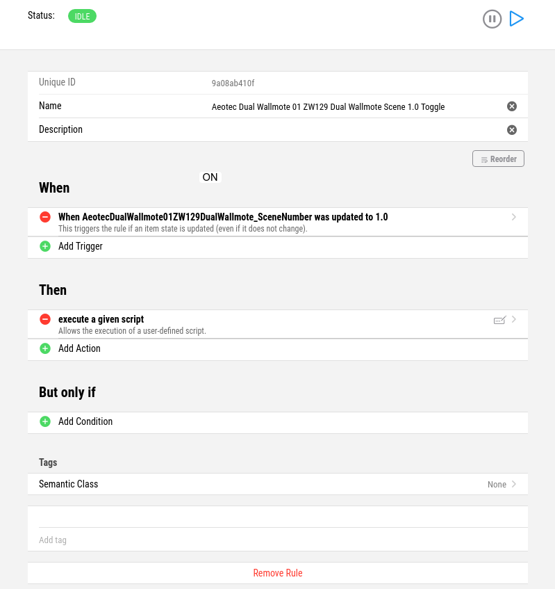Lastly, you can do all of this with rules, but this gets much more complicated and you will have to familiarize yourself with the creation and operation of timers in rules and how to get those timers to persist between different iterations of a rule. Something like this is what I do for most of my living spaces where there’s a chance that someone is in the room without significant motion for a long duration because I can use metadata to distinguish between items that have been turned on automatically and thus should be turned off automatically and items that have been turned on manually and should remain under manual control. Furthermore, I can alter the both the ON and OFF responses based on the time of day.