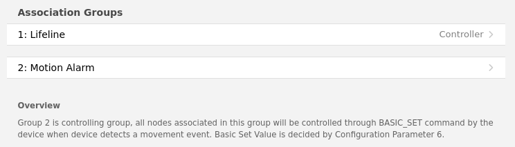 Any other z-wave item you add to this association group will get a direct On/Off signal from the sensor when it changes its state. Even though you are setting that parameter via OH that link is part of the z-wave network and works independently of OH. So, even if your OH system goes offline for some reason motion control will still work for that light. (I have this setup in a few rooms that require no flexibility and have z-wave sensors and z-wave light controllers).